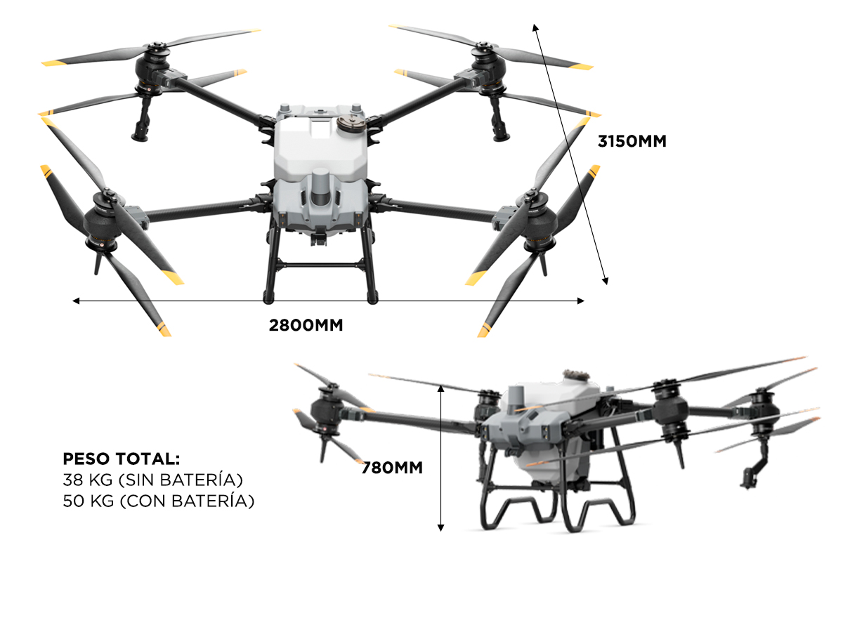 • Peso máximo al despegue: Peso máximo al despegue para pulverizar: 90 kg (al nivel del mar) / Peso máximo al despegue para esparcir: 101 kg (al nivel del mar)
